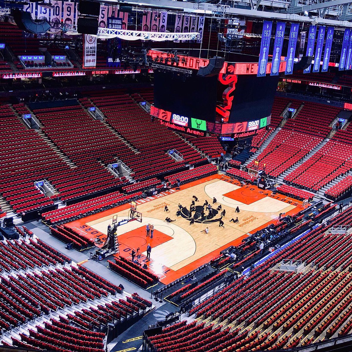 5月20日 猛龙今日在官方推特中晒出了一组今日主场球馆的内部布置图,观众席中铺满了写有“北境之王”字样助威T恤。