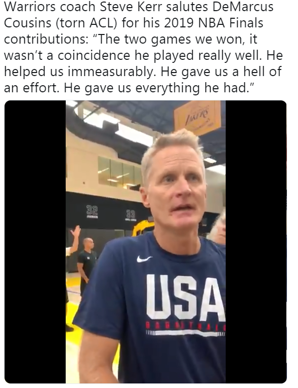 北京时间8月16日,勇士队主帅、美国男篮助教史蒂夫-科尔在美国男篮训练场接受采访谈到了德马库斯-考辛斯的伤病。