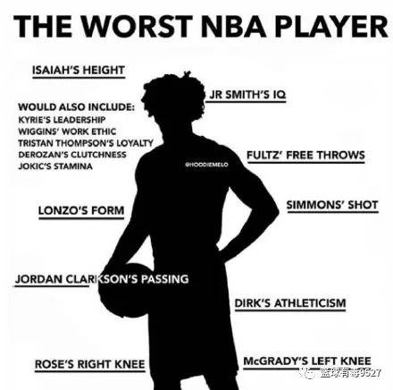 “NBA最差球员模板”具有:托马斯的身高、鲍尔的投篮动作、克拉克森的传球、罗斯的右膝、麦克格雷迪的左膝、诺维茨基的运动能力、西蒙斯的投篮、富尔茨的罚球、JR的智商、欧文的领导能力、维金斯的职业态度、TT的忠诚度、德罗赞的心脏和约基奇的体力。
